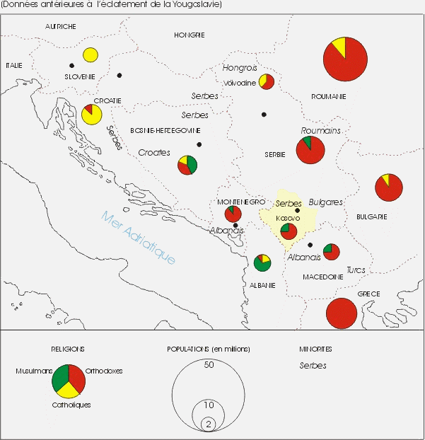 Comme le montre la carte ci-dessus, on y trouve une véritable mosaïque de langues et de religions. Seule la Slovénie est à peu près homogène. Partout ailleurs la religion majoritaire (catholique à l’ouest, orthodoxe à l’est, musulmane en Albanie, Kosovo, Bosnie) doit composer avec les autres. Partout la communauté linguistique majoritaire cohabite avec une ou plusieurs communautés linguistiques minoritaires. Complication supplémentaire, chaque peuple ne s’identifie pas entièrement à une religion : par exemple, il y a des Serbes musulmans, des Albanais catholiques ou orthodoxes, etc…