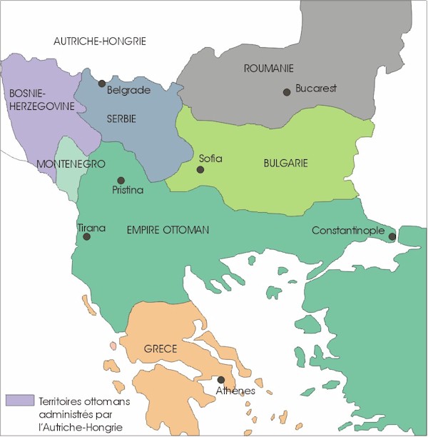 Le mouvement d’émancipation des peuples balkaniques commence par la révolte serbe de 1805. On voit apparaître successivement la Serbie (sans Kosovo), la Grèce, la Roumanie, le Monténégro, au cours de péripéties compliquées. Tour à tour, ces pays arrachent la reconnaissance de leur indépendance et agrandissent peu à peu leur territoire au détriment de l’empire ottoman. L’aide des puissances européennes s’avère décisive dans ce processus. La conférence de Berlin (1878) est une étape importante de cette évolution.