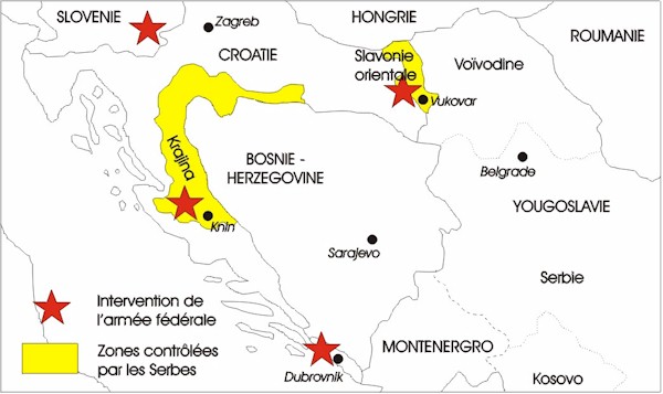 En revanche, les choses se passent plus difficilement en Croatie. Les régions de Krajina et de Slavonie où vit une forte minorité serbe, sont arrachées à la Croatie par les milices serbes avec l’aide de l’armée yougoslave. Ils s’y livrent à une sauvage « purification ethnique » : viols, exécutions, pillages.