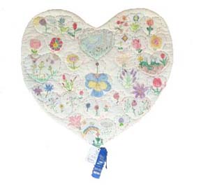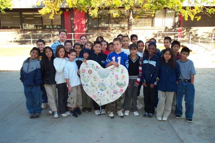 Last year in Mr. Jackson’s class of 5th and 6th graders, they decided to do a class project. Mrs. Ellen Bottorff, an aide at the school, loves sewing and said she’d be glad to help them make a quilt. She has helped us make a quilt, in memory of Mr. Richard Follett (a teacher at our school who died from cancer), one for Martin Luther King Jr., and one for Columbine High School. The class decided to make the quilt for Kosovo. They had been hearing a lot about the war at the time. They decided to make the quilt in the shape of a heart and have flowers with hearts sewn around them. The hearts represent the love from our country to yours, and the flowers represent new beginning.